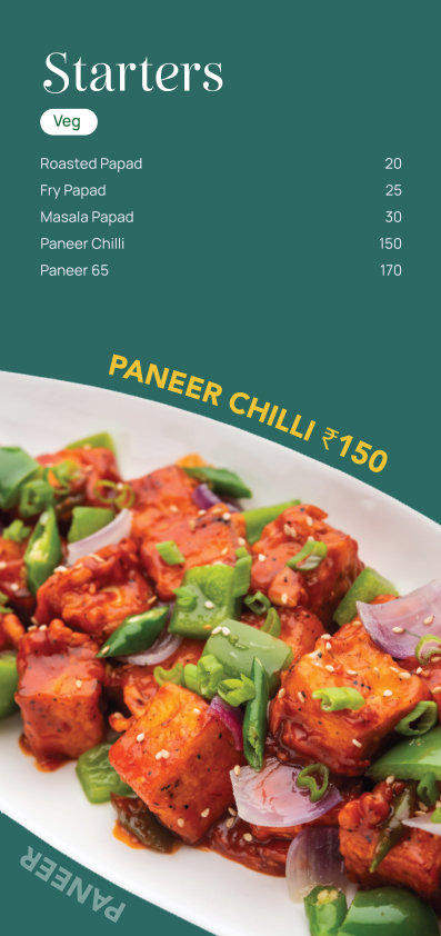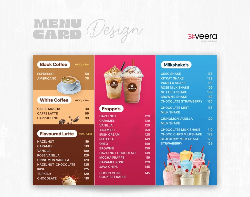 At Aveera Design, our menu card designers in Pune combine strategy and creativity to deliver menus that sell more — through the power of psychology, layout, and color balance.