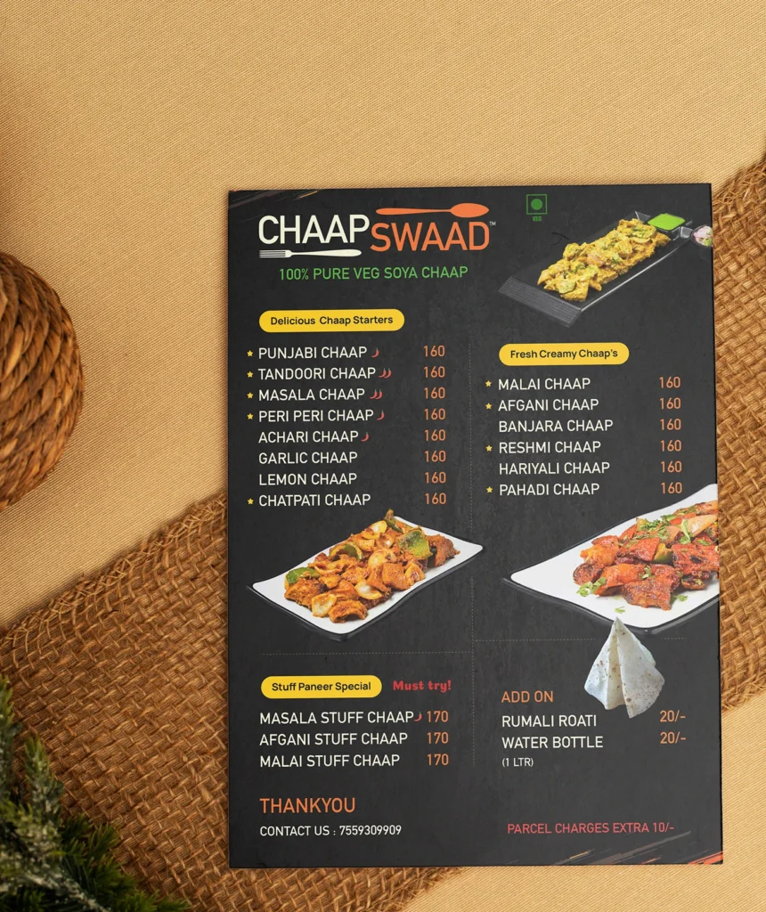 Whether you run a fine-dine restaurant, café, food truck, or QSR, our menu card design service in Pune is tailored to match your business style and audience.